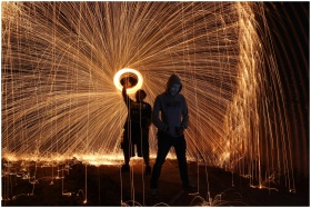 Silhouettes amidst stunning long exposure steel wool sparks at night.