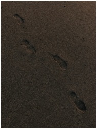 Footprints trailing through dark brown sand captur