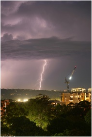 Striking lightning bolt over city skyline at night, illuminating clouds and buildings.
