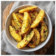 Close-up of homemade roasted potatoes with a golde