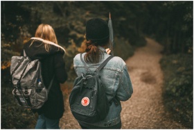 Two friends explore a forest trail together with backpacks, enjoying nature.