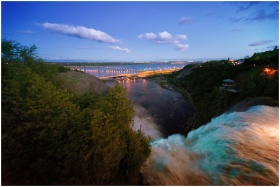 A breathtaking view of a waterfall with a distant cityscape and bridge during twilight.