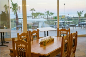 Wooden furniture in a beachfront patio setting with a view of the ocean and palm trees, perfect for a summer vacation.