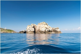 Serene view of a rocky island surrounded by calm ocean waters under a clear blue sky.