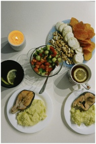 A delicious spread featuring fish, fresh salad, nuts, and tea, perfect for cozy evenings.