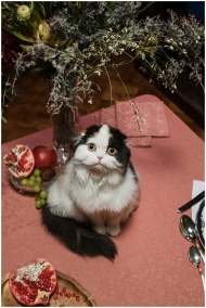 Charming Scottish Fold kitten sitting on a table with fruits and flowers creating a warm ambiance.