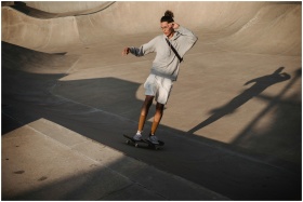 From above full body of determined male athlete riding skateboard on ramp during workout in skate park