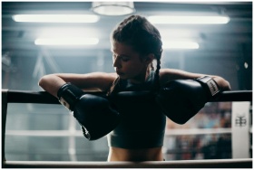 Determined female boxer in training breaks between intense sparring sessions.