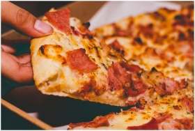 Close-up of a hand holding a delicious slice of pepperoni pizza.