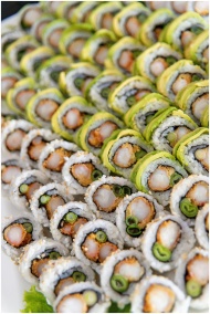 Vibrant sushi platter with fresh vegetables and so