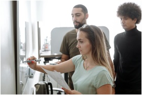 Three young professionals brainstorming on a white
