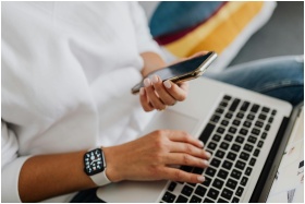 Close-up of a person using a smartphone and laptop for work, showcasing multitasking in a modern home office setting.