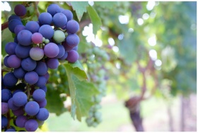 A vibrant bunch of ripe grapes hanging on a vine in a sunlit vineyard.