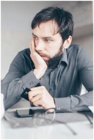 A worried man in a gray shirt holds a credit card,
