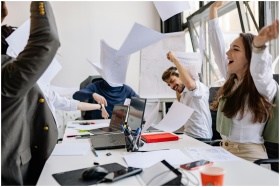 Group of diverse business professionals celebrating success in a modern office setting.