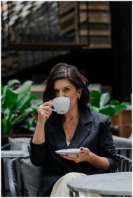 Stylish woman sipping coffee in a modern indoor café setting with greenery.