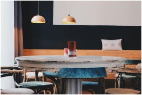 A stylish café interior featuring vintage wooden furniture and contemporary lighting.
