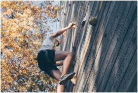 A person enjoying a thrilling wall climbing experience outdoors with fall foliage.