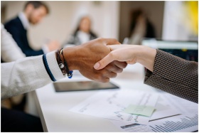 Diverse business professionals exchanging handshake in an office environment, symbolizing agreement.
