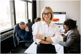 Smiling businesswoman in white shirt guiding her team in a modern office environment.