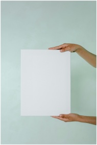 White blank card held by hands against a minimalis