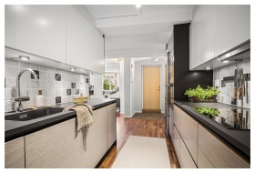 Modern kitchen interior featuring sleek white cabi