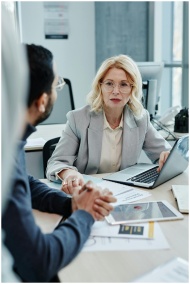 Caucasian woman leading a business meeting in a modern office setting.