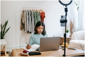 Focused young woman working on laptop in home office, surrounded by clothing rack and camera setup.