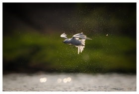 Two seagulls gracefully flying near a wooden post