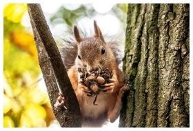 Gray squirrel perched on a rock enjoying a nut. Ca