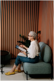 An adult woman in casual attire reviewing notes on a tablet in a stylish office setting.