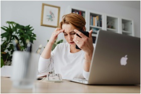 A stressed woman holds her phone, working at a des