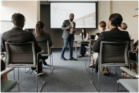 Diverse group attending a business seminar with a presenter and screen display.