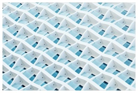 A detailed view of a modern apartment building fac