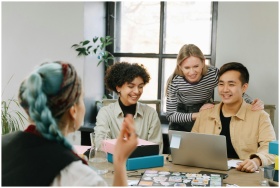 A diverse group of colleagues collaborating in a m