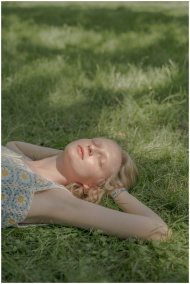 A young woman with eyes closed, laying on grass, e
