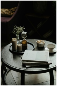 A cozy coffee table setting with books, candles, and a cup of tea - perfect for a relaxing break.