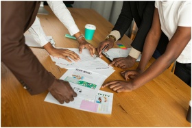 A diverse group of professionals actively discussing documents and collaborating on a project.