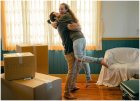 Side view full body barefoot young bearded male in casual clothes standing against window and lifting laughing girlfriend up during relocation and unpacking things from cardboard boxes