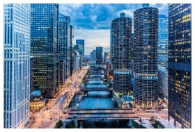 Dramatic view of Chicago skyline with reflections