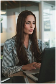 Focused businesswoman with long hair working on a laptop in a modern office environment.