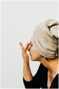 Side view of a woman applying skincare cream with a towel wrapped on her head.