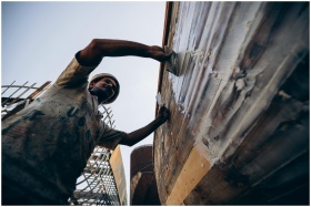 A craftsman skillfully restores a wooden boat in Damietta, Egypt, highlighting traditional craftsmanship.
