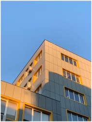 A modern office building with yellow accents under a clear blue sky, basking in sunlight.