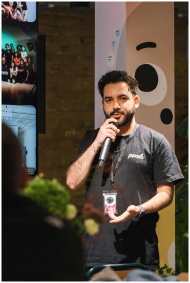 Man delivering a speech with a microphone at an in