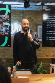 A man conducting a presentation with slideshow screens in an indoor setting.
