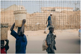 Three young boys carrying buckets on a busy outdoor street scene, showcasing daily life.