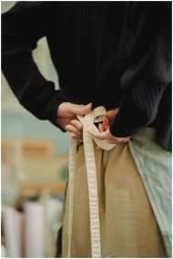 Back view crop anonymous female cafeteria or store worker tying up apron lace straps before duty
