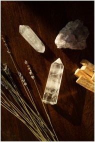 A calming flat lay of crystals, lavender, and palo