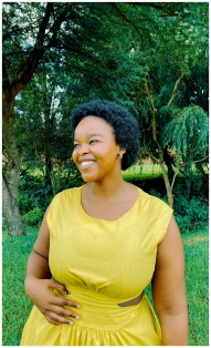 A joyful woman in a yellow dress stands in a vibrant green park, smiling.